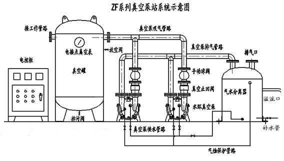 ZF系列真空泵站(又名真空發生裝置、真空負壓站等)是以一臺或二臺水環真空泵作為真空獲得設備,以真空罐作為真空存儲設備的成套系統。對于頻繁使用真空源而所需抽氣量不太大的場合下,該系統比直接使用真空泵大大節約了能源,并有效提高了真空泵的使用壽命。